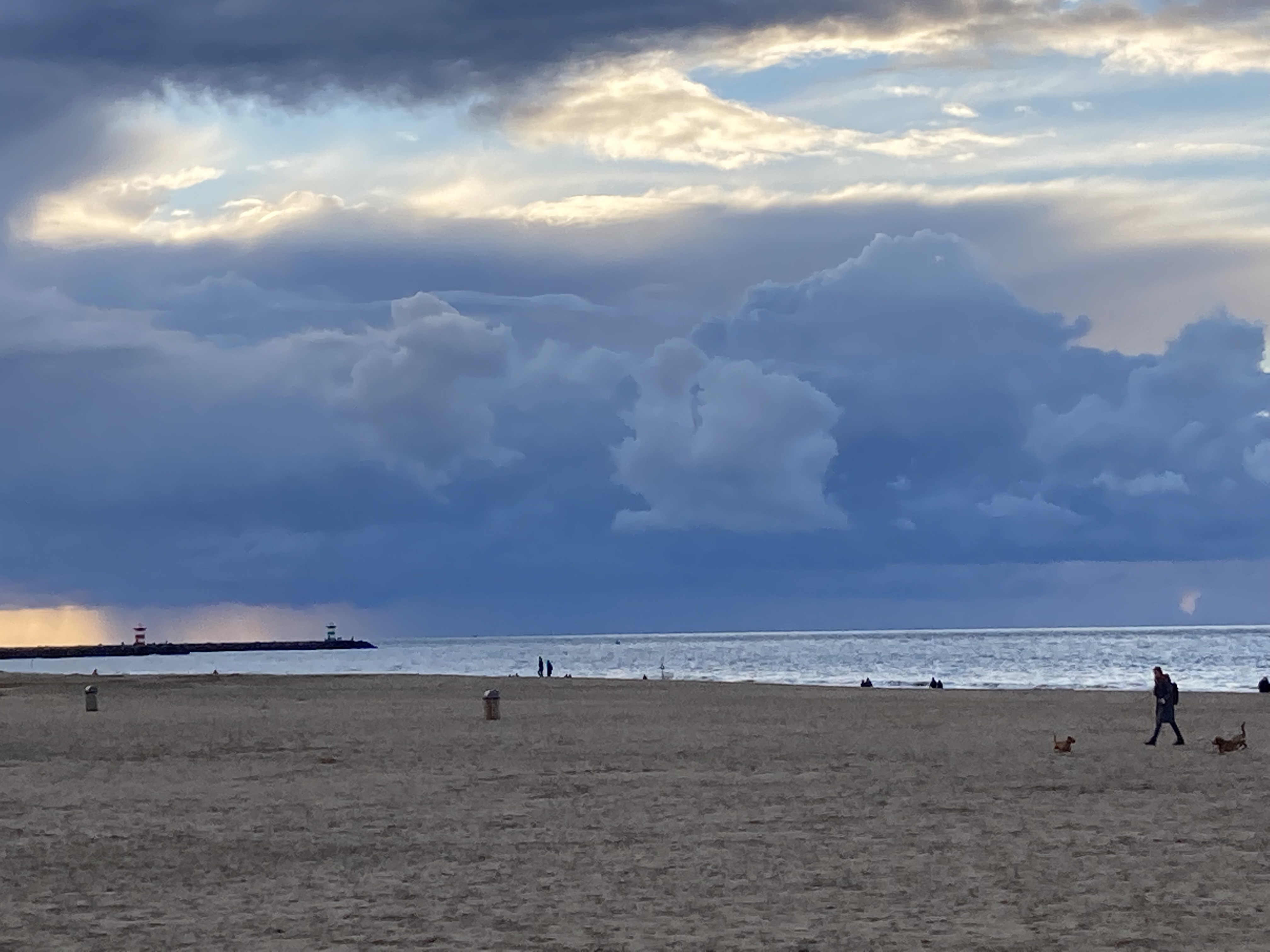 Na de thee zijn we eigenlijk nog niet uitgewandeld en dus besluiten we om de boulevard af te lopen langs het strand en langs de zee. Prachtige wolkenluchten vergezellen ons. Via de haven van Scheveningen door de Frederik Hendriklaan (de Fred voor intimi) waar je heel lekker kunt winkelen, naar huis. Mijn stappenteller geeft 21.000 stappen aan. Whoop whoop!