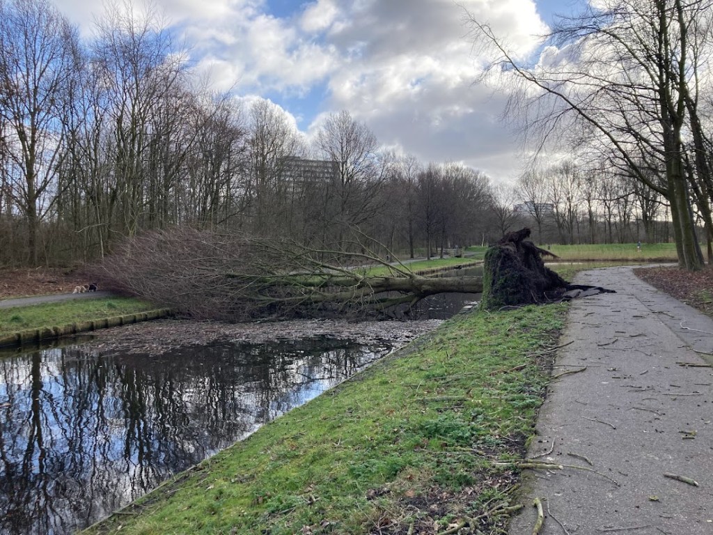 Hier is het anders. Eunice heeft flink huisgehouden. Ze is haar zelfbeheersing verloren en is losgegaan. Een reus van een boom heeft ze uit de aarde losgerukt en omvergeworpen. De boom is daardoor over de sloot geklapt, waardoor het een brug lijkt.